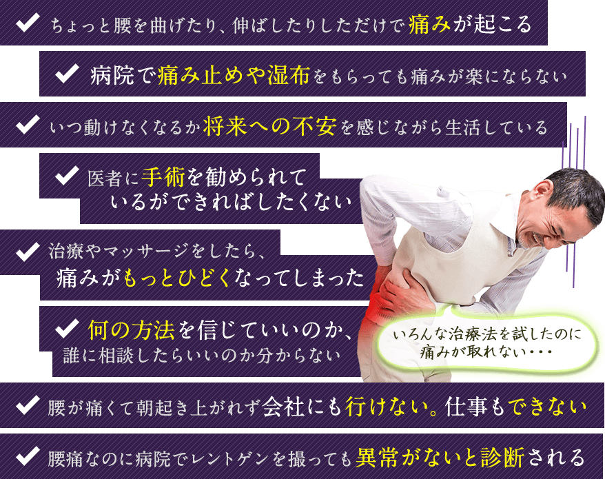 確かに一口に腰痛と言っても、坐骨神経痛・椎間板症・椎間板ヘルニア・分離症・すべり症・腰椎変形症・脊柱管狭窄症といった名称あります。実際に病院でそのような診断を頂いた方も数千人を施術しましたが、素晴らしい結果がでます。病院の診断は間違いありませんが、それが本当に痛みの原因かどうかは分らないというのが最新の腰痛研究です。レントゲンで見た体と、実際の体は全く違うからです。